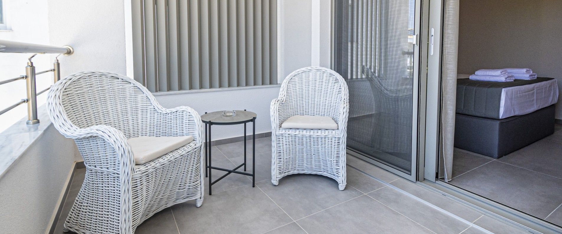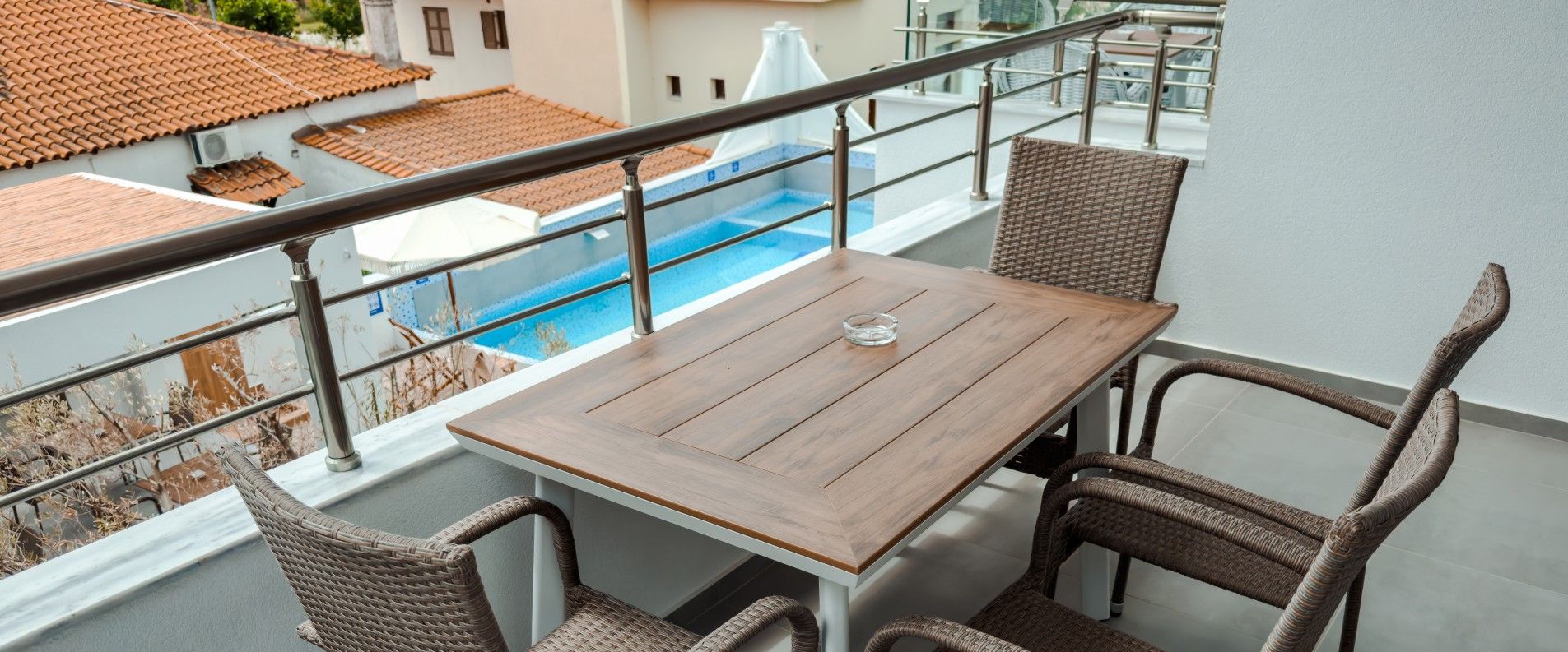Suite "AMMOΣ" provides two spacious terraces, one is overwatching backjard's swimming pool and second one overwatching private parking and main street.