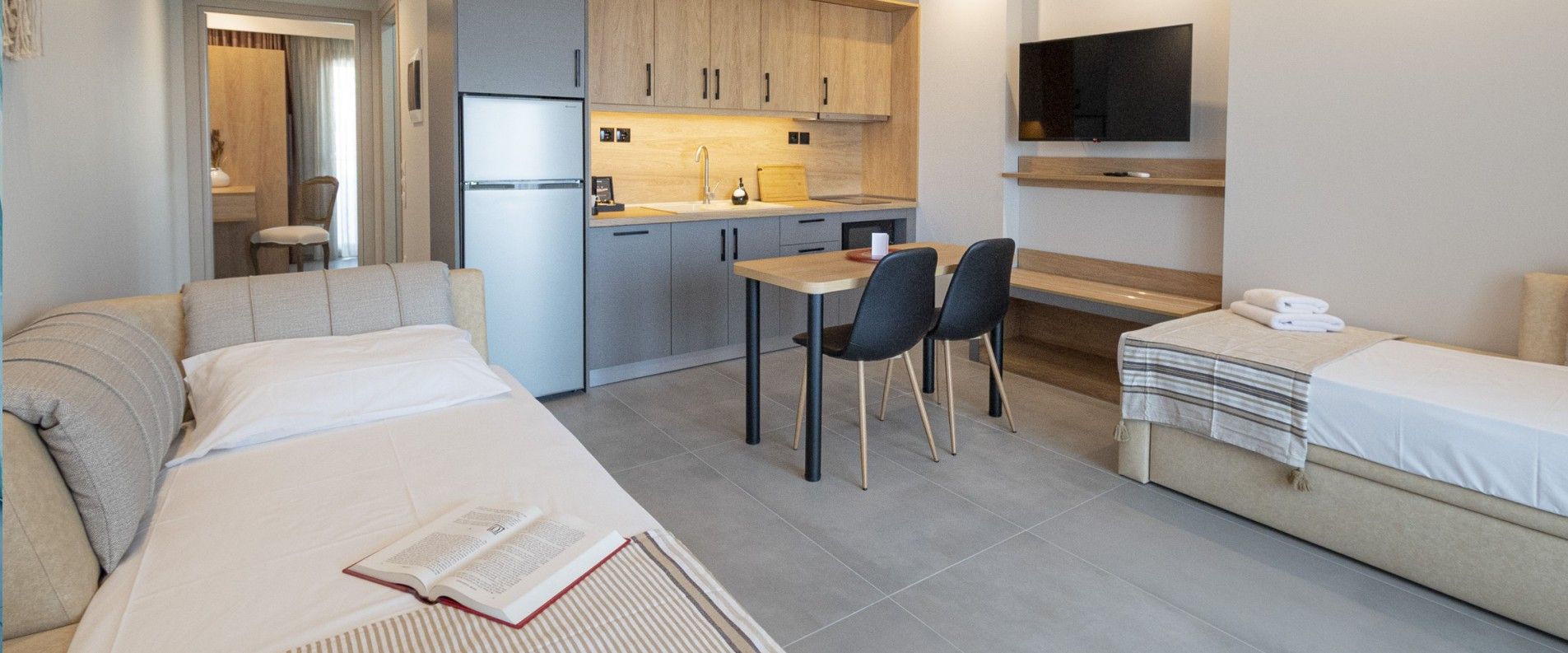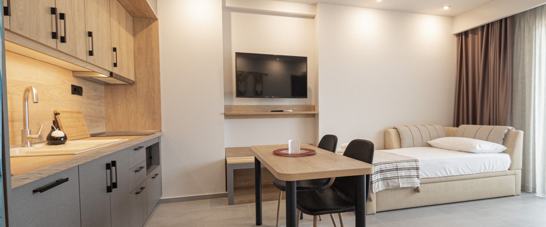 W.C/shower, κitchen with stove and microwave oven - grill is available with all cooking appliances, 43'' Sat smart TV at the living room, High speed WiFi, 24/7 surveillance by security cameras around the perimeter and private parking area, are also included in the standard price.