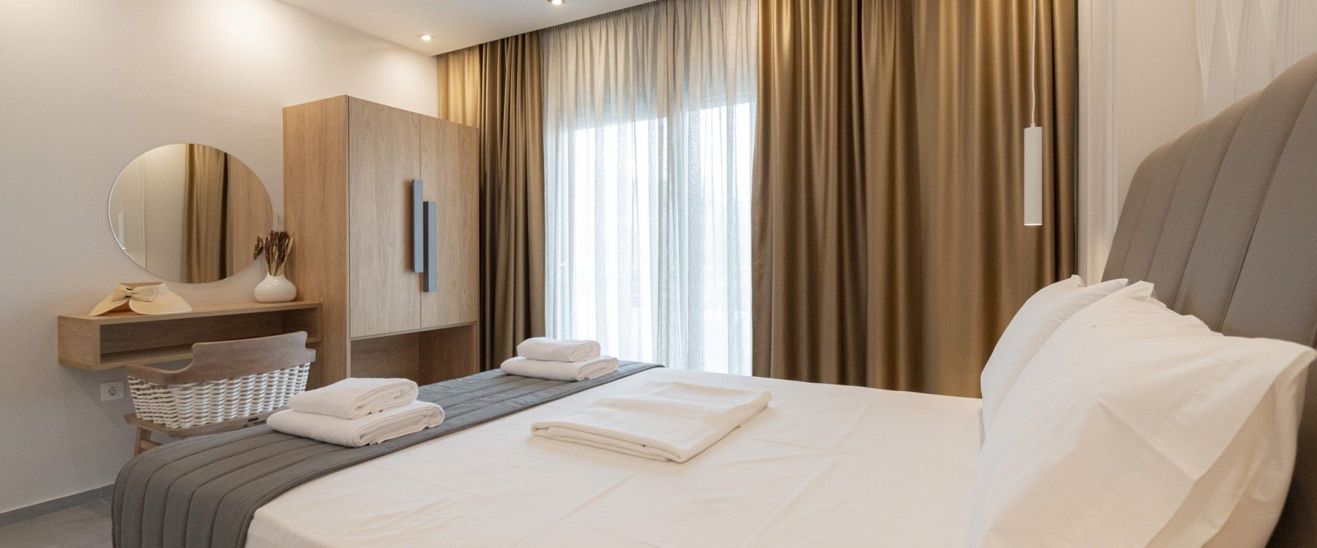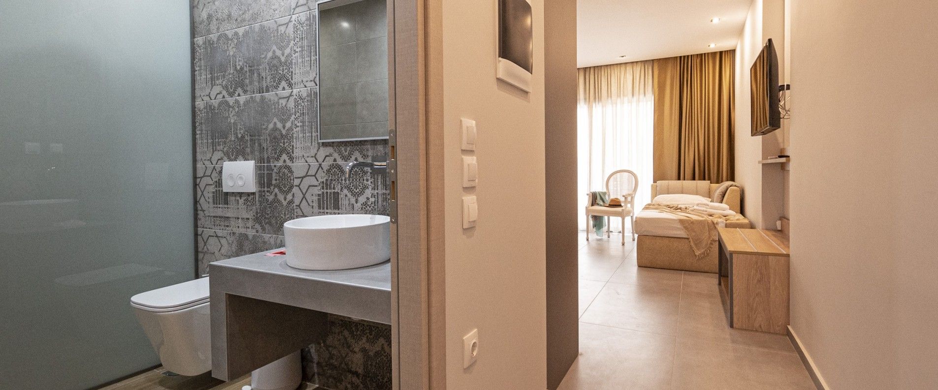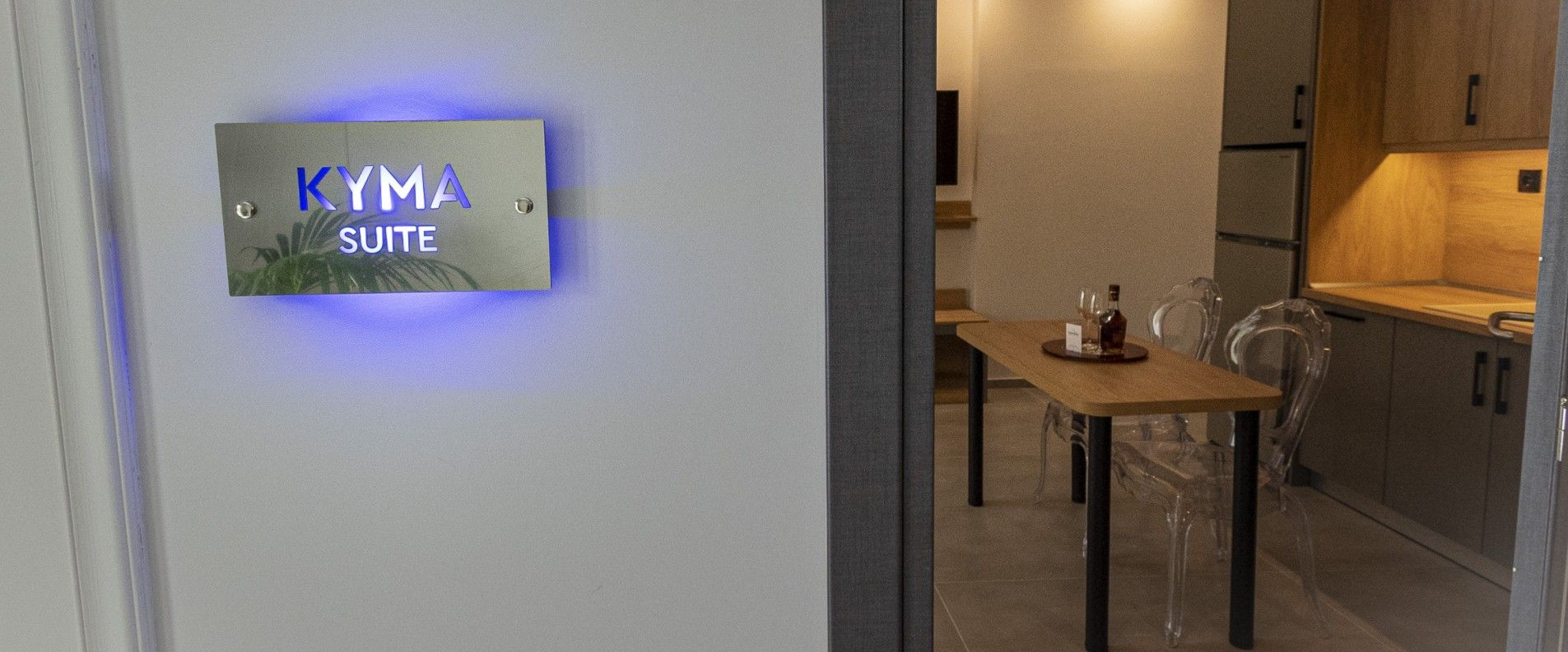 “ΚΥΜΑ” (WAVE) is a deluxe 5 people, almost 50 sq.m. suite, tastefully decorated, containing a cozy, air-conditioned bedroom with a King Size, tailor-made bed with anatomic mattress and a spacious, air conditioned, living room that can accommodate 2 or 3 more people.