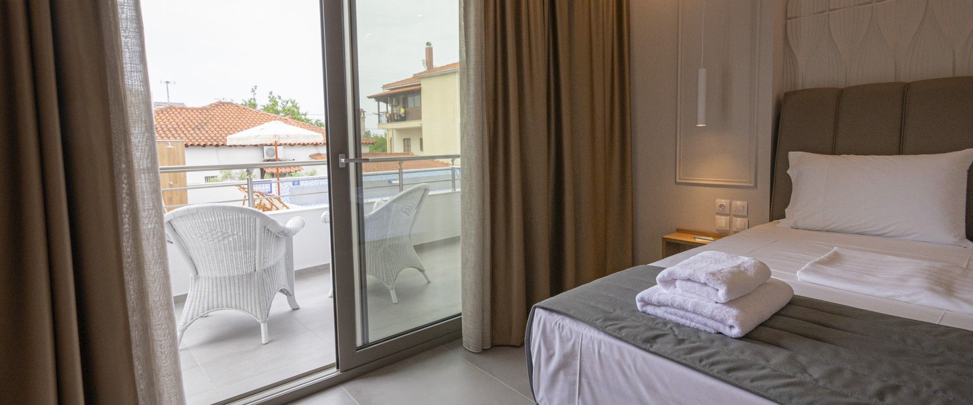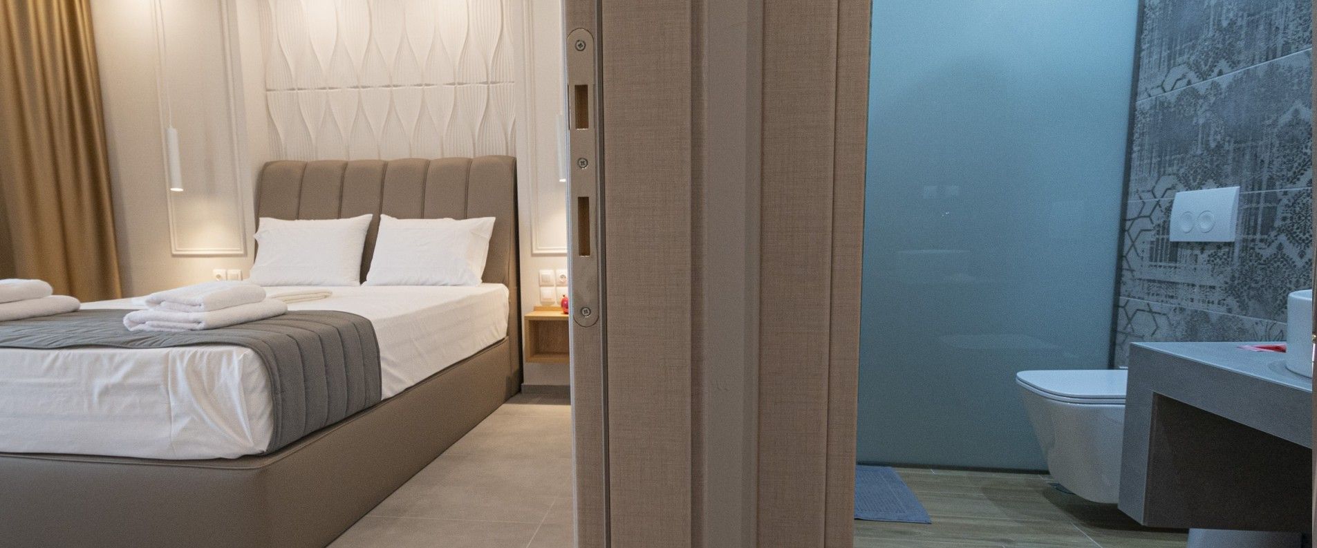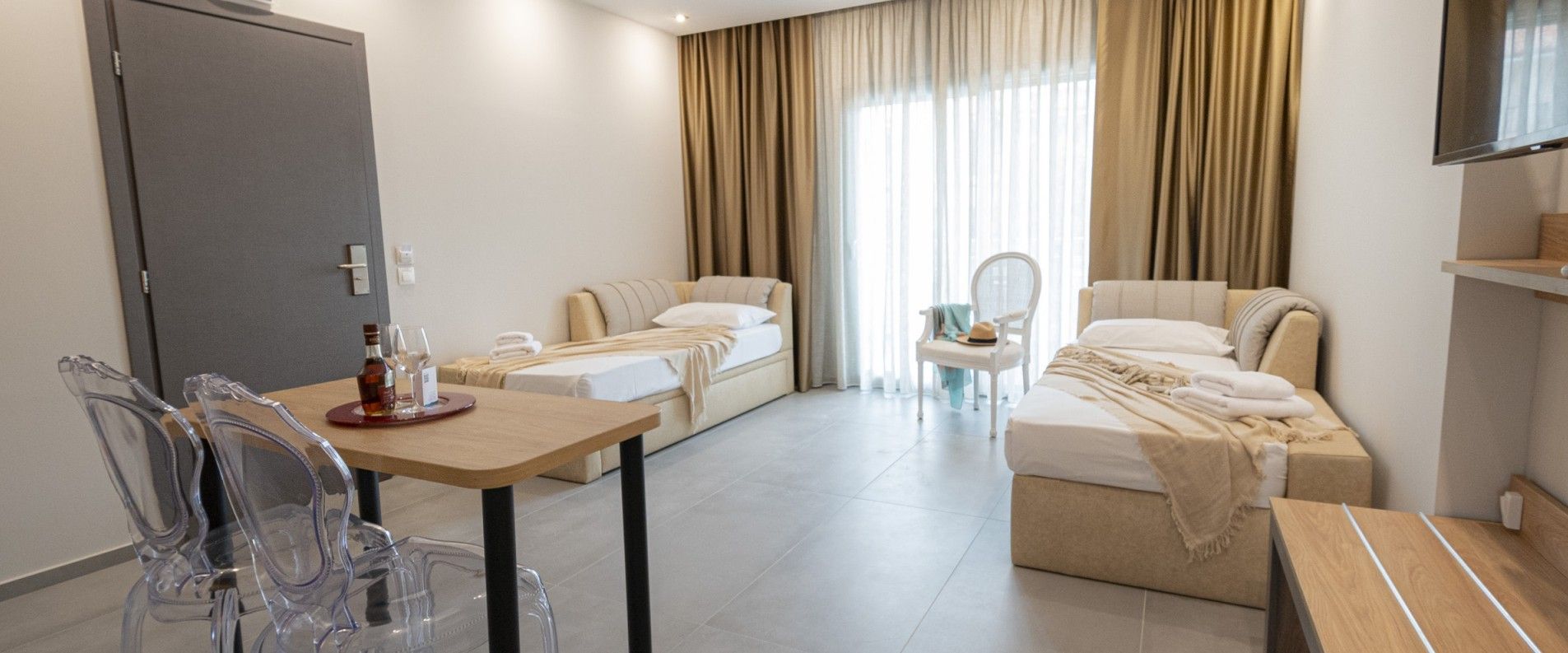 “ΚΥΜΑ” (WAVE) is a deluxe 5 people, almost 50 sq.m. suite, tastefully decorated, containing a cozy, air-conditioned bedroom with a King Size, tailor-made bed with anatomic mattress and a spacious, air conditioned, living room that can accommodate 2 or 3 more people.