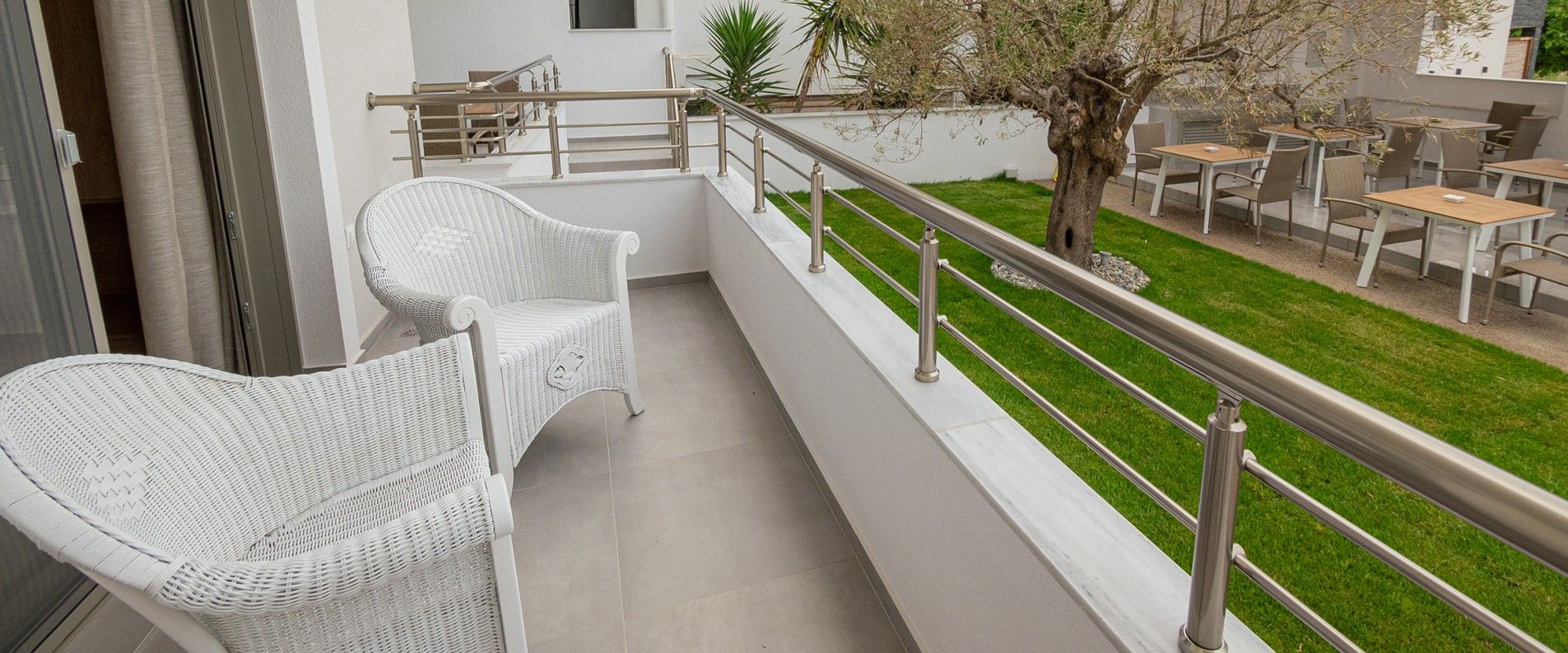 Suite "ΚΥΜΑ" provides two spacious terraces, one is overwatching backjard's swimming pool and second one overwatching private parking and main street.